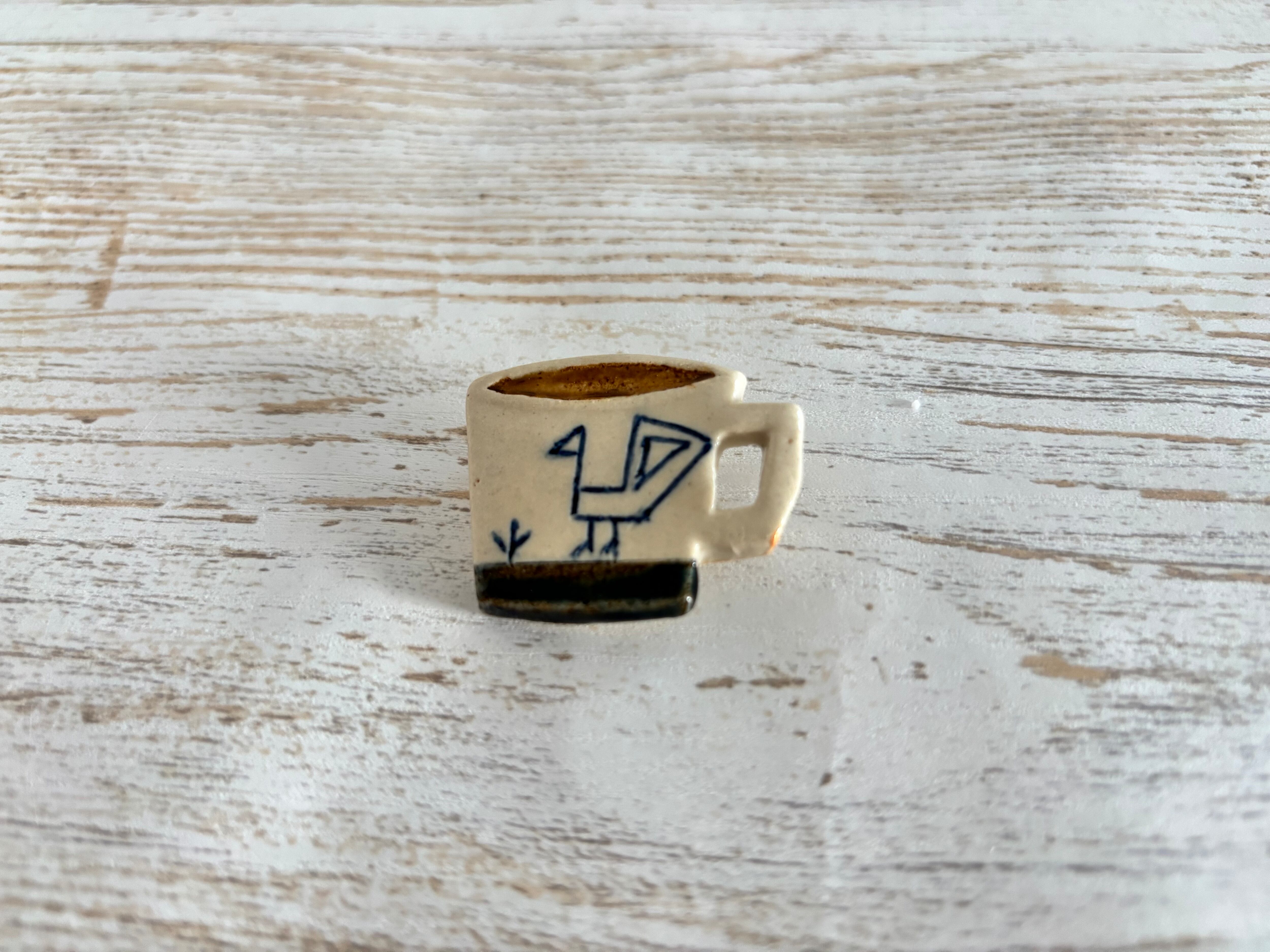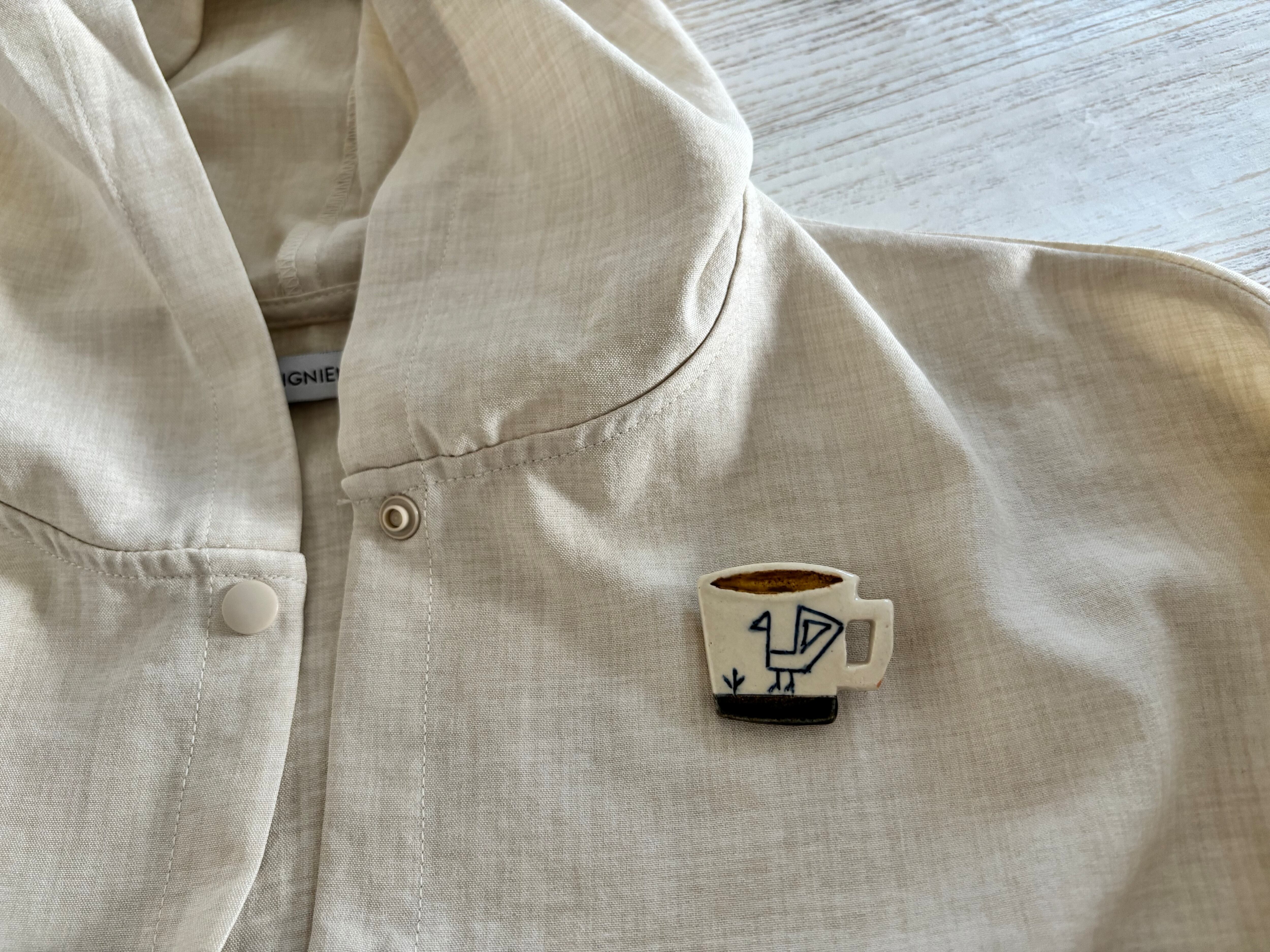 カップをモチーフにした陶器のブローチです。 適度な重さがあるので天然の素材に馴染みます。 大きさは約4cm、厚みは1cmです。